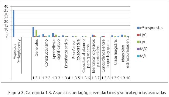 Por subcategorías, 13 de las encuestas se refieren a la 1.3.1. Aspectos generales, 10 hombres, 9 de Letras (2 Pamplona, 3 Santiago, 3 Valencia y 1 Tarragona) y 1 de Ciencias, de Valencia; mientras que de las 3 mujeres, 2 son de Letras (Sevilla y Granada), y 1 de Ciencias, de Santiago. El 11% del profesorado masculino y el 15% del femenino, principalmente de Letras, es consciente de la relevancia de estos aspectos a la hora de desarrollar buenas prácticas en el aula, sin embargo no son capaces de concretarlos. De hecho, algunas de las repuestas así lo ponen de manifiesto "tener una metodología pedagógica, dominar técnicas pedagógicas, dominar métodos pedagógicos".