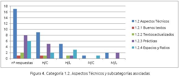 Con 6 respuestas, la subcategoría 1.2.4. Espacios y ratios apropiados, por 5 hombres, 2 de Ciencias (Santiago y Valencia), y 3 de Letras (2 Valencia y 1 Santiago), y por 1 mujer de Ciencias, de Santiago, en ambos casos responden al 5% de la muestra. Por debajo de este porcentaje, y con 2 respuestas, la 1.2.2. Empleo de textos actualizados, por 2 hombres, 1 de Ciencias, de Tarragona, y 1 de Letras, de Pamplona. Finalmente, cierra este apartado de aspectos técnicos, con 1 respuesta, la categoría 1.2.1. Empleo de buenos textos, citada por 1 hombre de Ciencias, de Pamplona.