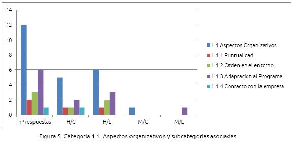 Dentro de los aspectos organizativos, con 6 respuestas, la subcategoría 1.1.3. Adaptación al programa. Planificación y desarrollo es destacada por el 5% de los varones, 3 hombres de Letras (2 Pamplona, y 1 Valencia) y 2 de Ciencias (Pamplona y Valencia), y también por el 5% de las mujeres, 1 mujer de Letras de Pamplona. Por debajo de estos porcentajes, y con 3 respuestas, la subcategoría 1.1.2.Orden, por 3 hombres, 1 de Ciencias, de Pamplona, y 2 de Letras (Sevilla y Valencia); con 2 respuestas la 1.1.1. Puntualidad, por 2 hombres, 1 de Ciencias, de Pamplona, y 1 de Letras de Santiago. Para finalizar, con 1 respuesta la subcategoría 1.1.4. Contacto universidad-sociedad-empresa, 1 hombre de Ciencias, de Pamplona.