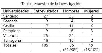 Para construir la muestra, el equipo de investigación invitó a todos los profesores eméritos vinculados de alguna manera a las universidades participantes en el proyecto. En la selección de los docentes que participaron en el estudio se tomaron en cuenta criterios que permitieran establecer posibles patrones para la consecución de la excelencia académica, así como cubrir todas las áreas del conocimiento, por parte de hombres y mujeres. De los profesores eméritos procedentes de las universidades de Santiago, Granada, Sevilla, Pamplona, Valencia y Tarragona, 19 son mujeres (18.10%), y 86 son hombres (81.90%).