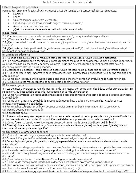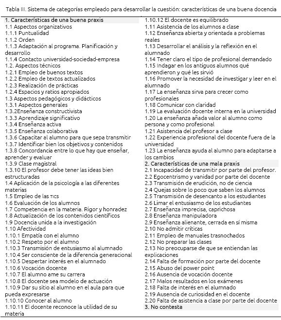 La temática que aborda el estudio (ver tabla II), es amplia. En esta ocasión nos centraremos en el análisis de la cuestión 6.4 que se refiere a "Vistas desde su larga experiencia como profesor/a universitario, ¿cuáles serían en su opinión las características principales de una buena docencia?, ¿en qué podríamos distinguir una buena de una mala docencia?"