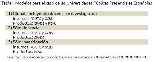 Escenarios. Para evaluar el rendimiento de la educación superior pública en España, se plantean tres escenarios o modelos: 1) global; 2) sólo docencia; y 3) sólo investigación, véase la tabla I. Dichos modelos son comparables en su metodología a los estudios de Worthington y Lee (2008) y de García-Aracil et al. (2010), aunque estos últimos agregan también el escenario de sólo transferencia del conocimiento.