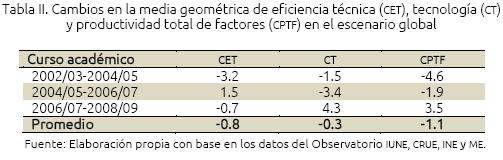 El incremento en el número de universidades españolas con mejoras en productividad ha permitido alcanzar al total, en los cursos académicos analizados, cambios que han pasado de -4.6% en 2004/05, a -1.9% en 2006/07, y a 3.5% en 2008/09. En el último curso, la mejora de la productividad total se descompone en un 4.3% de cambio tecnológico y un -0.7% de cambio en la eficiencia técnica, lo que indica que esta mejora de la productividad se produce por una expansión de la frontera de mejores prácticas, y no de un cambio positivo en eficiencia.