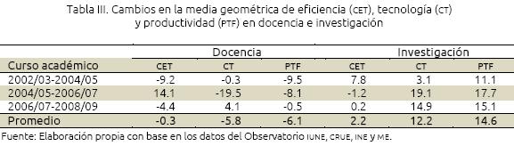 Sin embargo, separando el proceso productivo en docencia e investigación, el análisis de la productividad refleja que su crecimiento fue asociado con cambios positivos en la investigación más que en la docencia. A su vez, el aumento de la productividad en la investigación se asocia con las mejoras tecnológicas y, en menor proporción, con la eliminación de la ineficiencia tras la introducción del sistema de incentivos salariales a la investigación de alta calidad del personal docente e investigador, mientras que los cambios en la enseñanza procedían de muy poca mejora de la eficiencia técnica y del cambio tecnológico.