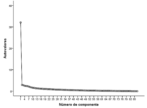 El primer factor, a su vez, explica hasta un 38.27% de la varianza total. Se extraen 18 factores de la matriz analizada, aunque a partir del segundo pueden considerarse residuales, porque llegan a explicar menos del 3% de la varianza total y carecen del sentido de análisis respecto al contenido. La situación se refleja en la figura 2, que ofrece el gráfico de sedimentación, vemos que el primer factor ofrece el mayor autovalor de todos los posibles, y los restantes son residuales, incapaces de explicar una cantidad relevante de la varianza total. Es decir, a partir del segundo autovalor no se pueden extraer más factores y éstos deben ser desechados.