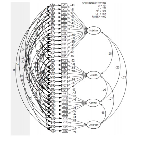 En la tabla VII se muestra la correlación entre factores, se encontró que el factor 1 y 2 presenta correlación positiva significativa, de manera similar el factor 3 y 4. Lo anterior indica que mientras mejor definición tengan los estudiantes de sus objetivos harán mayor uso de las herramientas de gestión. Además, se encontró que a mayor percepción de control se tenga, más preferencia por la desorganización de las tareas académicas.