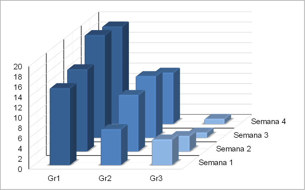 Mientras Gr1 y Gr2 fortalecían la cohesión de grupo según avanzaban las semanas para el cumplimiento de la tarea, en el Gr3 ocurría lo contrario; durante las últimas dos semanas, los estudiantes del Gr3 actuaban de manera desarticulada y trasmitían un esfuerzo individual -más que colectivo- sobre la tarea, es decir, sobresalían elocuciones sobre responsabilidades individuales (por ejemplo: “tú debes hacer…” “ya acabé mi propuesta”, “necesitas incorporar”, etc.), en tanto que el uso de pronombres inclusivos (por ejemplo: nosotros, estamos, debemos, etc.) y palabras cordiales (gracias por los comentarios, buenos días, que tengan buen fin de semana, etc.) disminuyeron con el tiempo (figura 1).