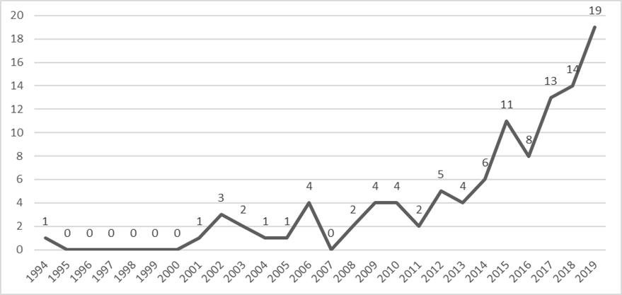 Figure 1 shows the number of articles on university environmental sustainability published between 1989 and 2019. Two main periods can be identified: the first from 1994 to 2011, when on average 1.3 articles were published per year, and a second period, between 2012 and 2019, when this figure jumps to an average of 10 articles. We note that the number of articles about environmental sustainability in the context of higher education has increased sharply in the last five years (Figure 1). This is due to increased attention given to serious environmental concerns and the pressure that universities face to implement institutional policies to meet these challenges.