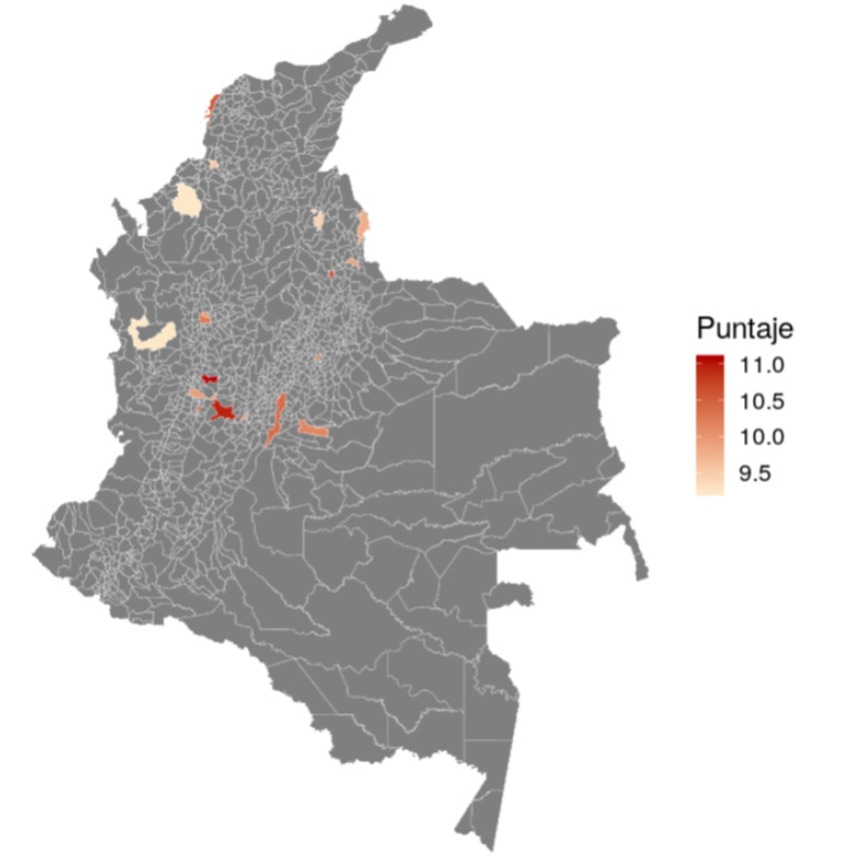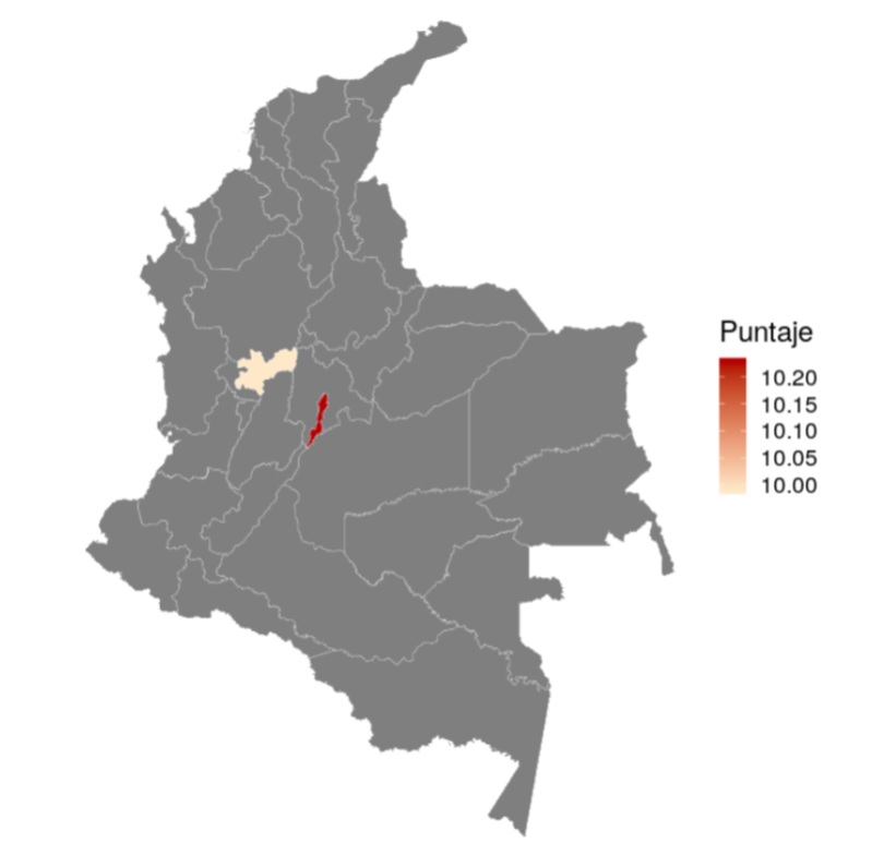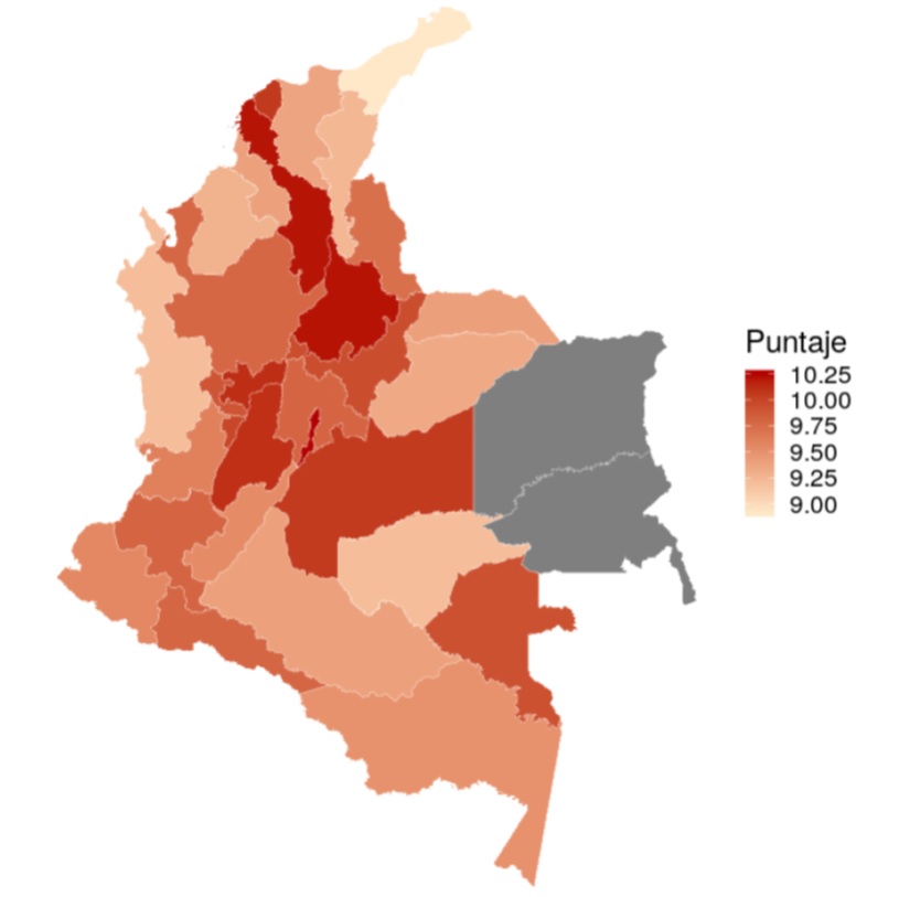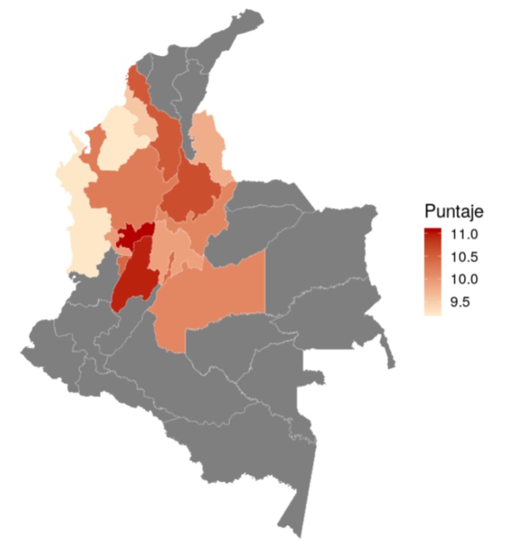 En concordancia con esta cobertura, en la Figura 3 se muestra el puntaje global promedio por municipio. La dispersión geográfica de los municipios representados en la muestra no permite una interpretación intuitiva. Debido a ello, se presentaron los datos agregados a nivel departamental, permitiendo una mejor aproximación en los programas del área (Figura 4). Aquí es posible observar desempeños más altos en los Departamentos de Atlántico, Bolívar (costa del Caribe) Santander, Bogotá (zona central de los Andes); y otros con puntajes promedio destacados como Caldas, Tolima (zona central de los Andes), Meta (Llanura Oriental) y Vaupés (zona Amazónica) (ver Tabla 1).