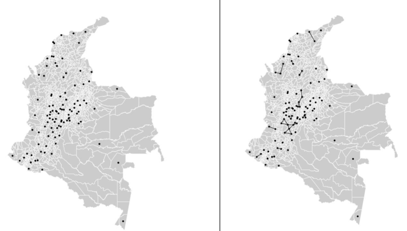 La DIVIPOLA comprende 1 101 municipios, la matriz de vecindades ilustrada mide 606 651 posibles vecindades. Por otro lado, al calcular la matriz de vecindades con los datos de este estudio, se muestra que el panorama es distinto (Figura 6).