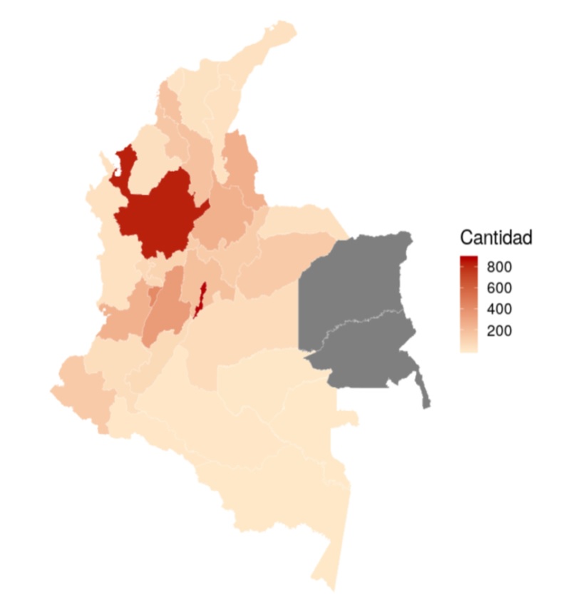 La cantidad de estudiantes evaluados por Departamentos en los programas de este estudio disminuye el nivel de desagregación territorial de la muestra. Así, 2 de los 32 departamentos registrados en la DIVIPOLA (Figura 2) carecen de datos para este estudio.