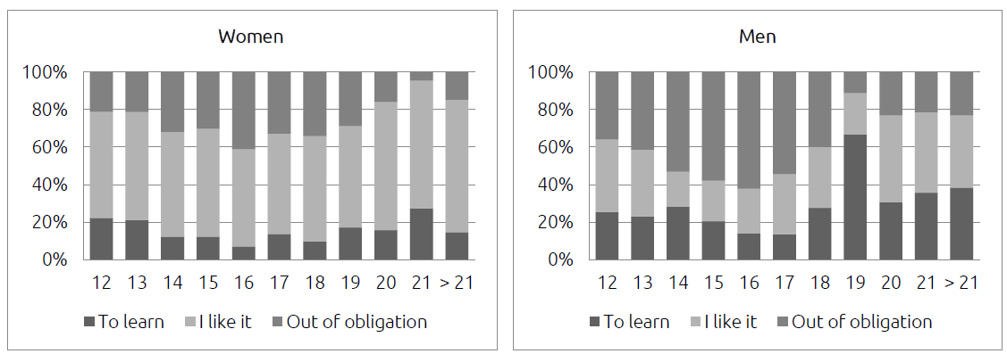 While a majority of women claim to enjoy reading, almost half of men say they read because they feel obligated to, particularly in the 14 to 18-year-old age range. This subjective perception of reading is a highly reliable indicator that shapes all results. This can be seen in Figure 11: