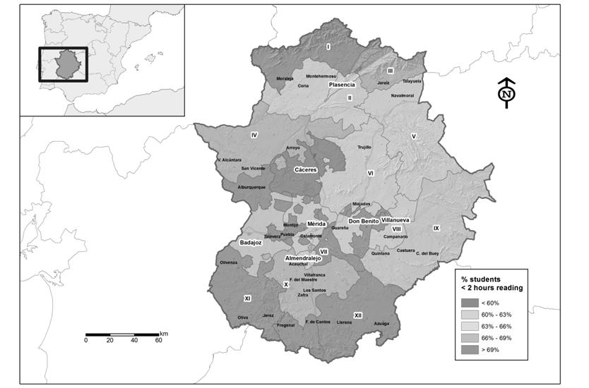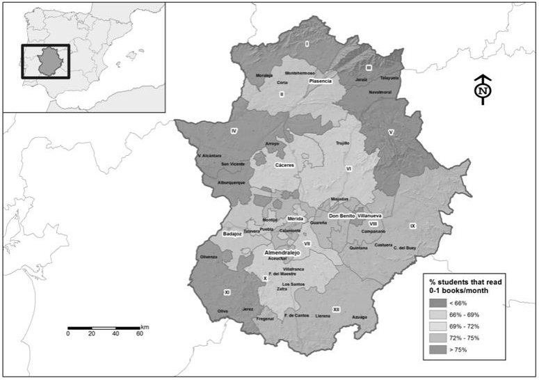 The secondary school students with the lowest reading rates are concentrated in the districts along the border with Portugal and in the north of the region (Figure 2) and partly mirror the map of students at the same educational stage who make the fewest book purchases (Figure 3). Along the same lines, purchases of books are associated with urban areas in the region, perhaps as a result of greater purchasing power and the broader range of books offered in towns and cities in comparison to rural settings.