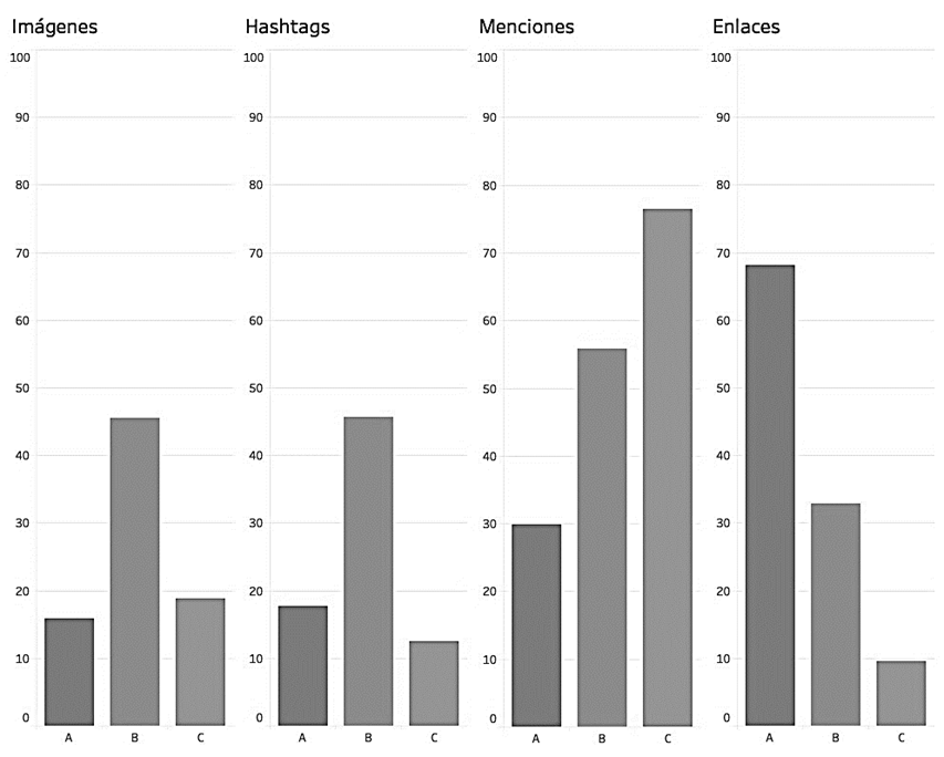 Del conjunto de tuits que se incorporaron a la base de datos se desprende que los estudiantes complementaron el contenido textual con la inserción de menciones, hashtags, imágenes y enlaces de forma desigual. En la Figura 1 se observa que, de los tres grupos, el B fue el que utilizó de forma más recurrente y equilibrada las distintas modalidades para enriquecer los contenidos. Este hecho es atribuible a que en el planteamiento de los ejercicios se hacía especial hincapié en explotar las posibilidades de la plataforma para enriquecer el contenido de los tuits. Además, el grupo C se distingue por un uso intensivo de las menciones (presentes en un 76.5% de los tuits). Este resultado podría estar estrechamente ligado a las especificidades de la tarea, que consistía en la narración en tiempo real de una conferencia en la que los estudiantes recurrían a la mención para atribuir la autoría de las distintas intervenciones de los conferenciantes. El grupo A destaca, en cambio, por la inserción de un elevado número de enlaces (un 68%) en los tuits que se puede relacionar con la práctica de compartir contenidos de internet relacionados con la asignatura y su voluntad de desarrollar contenido educativo.