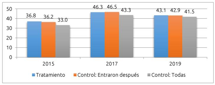 En las figuras 2, 3, 4, y 5, se presenta el porcentaje promedio de estudiantes con nivel de logro insuficiente y sobresaliente para el grupo tratamiento y para los grupos de comparación de todas las telesecundarias, al igual que para escuelas que entraron después. Se puede observar que en los colegios que fueron incorporadas al programa en 2014-2015, en los resultados de la prueba de 2015 tienen, en promedio, al 58.9% de sus estudiantes en el nivel de logro insuficiente en Matemáticas, y al 36.8% en Lenguaje y comunicación. En cambio, el grupo de control de todas las telesecundarias tiene, en promedio, al 56.7% en Matemáticas y al 33% en Lenguaje de estudiantes en el nivel de logro insuficiente. Es decir, en Matemáticas y Lenguaje hay, respectivamente, 2.2 y 3.8 puntos porcentuales más en el porcentaje de estudiantes con el nivel de logro más bajo en el grupo de escuelas pertenecientes al PETC que en el grupo de control. Estas diferencias son significativas estadísticamente al 5%. Entre estos grupos de comparación, para el año 2017 también se encuentra una brecha de 1.8 puntos porcentuales en Matemáticas y de 2.9 puntos porcentuales en Lenguaje. En contraste, en el año 2019 la diferencia sólo es significativa en la asignatura de lenguaje, siendo de 1.5 puntos porcentuales. La brecha en el porcentaje de estudiantes con nivel de logro insuficiente entre el grupo de tratamiento y el grupo de control de escuelas que entraron después no es estadísticamente significativa en ningún caso.