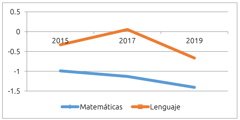 En 2015 el porcentaje de estudiantes con nivel de logro insuficiente muestra signo negativo en Matemáticas. Se puede notar que en 2017 el efecto del programa sobre el porcentaje de estudiantes con nivel de logro insuficiente es de -1.1 puntos porcentuales en Matemáticas, y para 2019 el efecto es de -1.4 puntos porcentuales. Es decir, parece que el efecto del programa sobre el rendimiento en Matemáticas se va haciendo más grande conforme pasa el tiempo. A pesar de esto, el efecto del programa en ningún año es estadísticamente significativo. 10 Lo mismo sucede con la asignatura de Lenguaje; los resultados se mantienen estadísticamente con el grupo de comparación de las escuelas que entraron después al programa (ver figura 8 y 9).