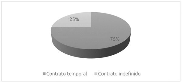 Respecto a las áreas de la empresa que se ven mejoradas con la FPD, el 50% de las empresas señaló la organización y eficiencia productiva, y el otro 50% marcó la gestión de recursos humanos (selección, formación, etc.). A este respecto, la figura 3 recoge que el 75% de las empresas contrató nuevamente al alumnado aprendiz después de finalizar la FPD, y que la modalidad contractual más habitual es la temporal (en el 75% de los casos). Le sigue la indefinida, con el restante 25% (esta última se da sólo en empresas situadas en el medio rural).