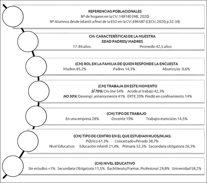 En la Figura 1 se presenta la síntesis de datos y resultados relativos a las características muestrales de los encuestados en la CV (2905 familias que informan sobre 4197 estudiantes). La muestra de familias es estadísticamente representativa (nivel de significación del 99%, intervalo de confianza <3%). También es representativa la de alumnado (nivel de significación del 99%, con un intervalo de confianza ≤ 2%).