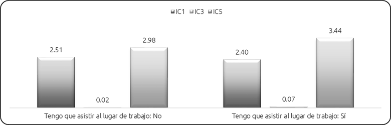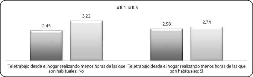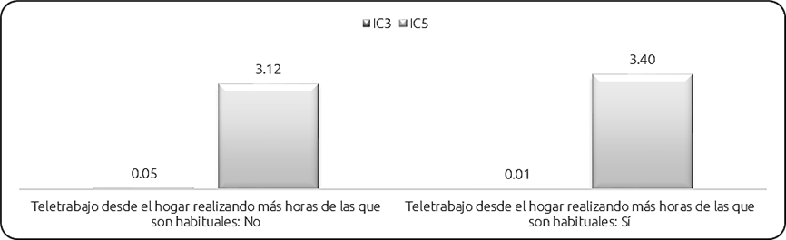 El contraste entre grupos de personas que están trabajando desde el hogar, mediante teletrabajo, con un horario similar al habitual o no, revela diferencias estadísticamente significativas para IC3 (p ≤ 0.007) e IC5 (p ≤ 0.001).