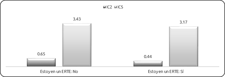 También se ha realizado el análisis para personas en diferentes situaciones de desempleo. No se han hallado diferencias estadísticamente significativas en los valores de los indicadores de brechas para las variables dicotómicas “estoy en paro desde hace tiempo”, “estoy en paro desde la declaración del estado de emergencia”, pero sí para la variable “estoy en paro temporalmente mediante un ERTE4”. En este último caso se constatan diferencias significativas para los indicadores de brechas IC2 (p ≤ 0.017) e IC5 (p ≤ 0.021) (Figura 12): tienen menos dificultades las personas que están en ERTE.