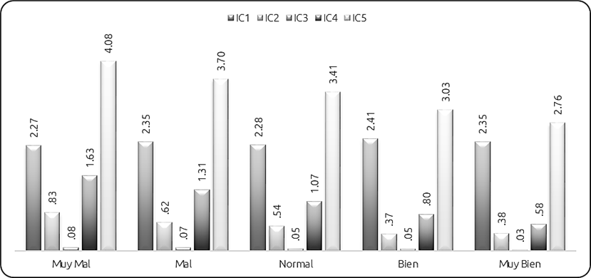 Respecto a la primera cuestión, en la valoración global de la experiencia de la docencia por internet se observan diferencias estadísticamente significativas en todos los ICs. En los IC1, 2, 4 y 5 (p ≤ 0.001) y en el IC3 (p ≤ 0.005). Quienes valoran peor la experiencia son los que peores condiciones (IC5) han tenido y, al contrario, los que mejor la valoran son los que menos dificultades han tenido en sus hogares. En IC3 e IC4 se mantiene la misma valoración que en IC5. Esa misma tendencia, pero con un pequeño matiz, se da en el IC2, pero desde muy mal a normal, estando bien y muy bien equiparados en su valoración (Figura 15).