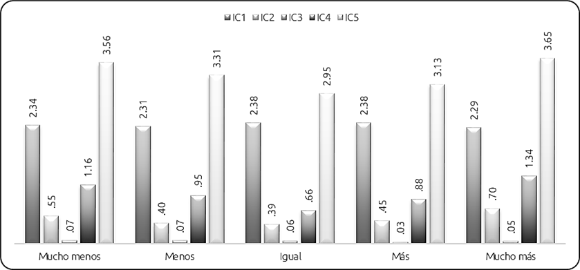 Las tendencias observadas (Figura 17), ponen de manifiesto una valoración prácticamente inversa en función de las condiciones globales (IC5) desde mucho menos a igual. Resulta curioso que los que indican que han aprendido mucho más tienen el mismo tipo de condiciones globales que los que señalan que han aprendido igual, pero los que señalan que han aprendido bastante más presentan peores condiciones que los dos últimos señalados. En IC2, salvo el grupo que señala que han aprendido mucho menos, que tiene las peores condiciones de recursos TIC, los demás presentan variaciones que no se asocian con claridad con una tendencia de percepción negativa/positiva de logro. Igual ocurre con IC3. En el IC4 es donde se aprecia una clara asociación negativa entre la percepción del logro adquirido y las condiciones vividas.