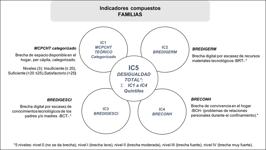 Los ICs representan condiciones de vida durante la pandemia identificando situaciones y dificultades que identificamos como brechas de calidad de vida. Son resultados de sumatorios de respuestas a diversos ítems. En Jornet et al. (2020) se dispone de la información específica de las preguntas que se incluyeron en cada IC. En la Figura 3 se presenta la descripción. En total se trabajó con cuatro ICs parciales y uno total. Los dos primeros reflejan condiciones estructurales de la vivienda (IC1) y recursos TIC disponibles (IC2); los dos siguientes: conocimiento de TIC por parte de la familia (IC3) y relaciones de convivencia creadas en esa situación prolongada de confinamiento (IC4); el IC5 representa la desigualdad total y es resultado del sumatorio de todos los indicadores: IC1 a IC4. El IC5 fue normalizado y estratificado en quintiles, de forma que el quintil 1 representa el menor nivel de problemas en las condiciones de vida en el confinamiento para poder atender la EEC.