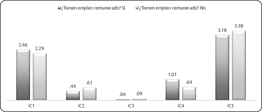La prueba U muestra diferencias significativas (p ≤ 0.001) entre quienes tienen trabajo y los no empleados, entre los ICs: los que trabajan tienen más dificultades en IC1 e IC4 y, menos en las IC2, IC3 e IC5 (Figura 5).