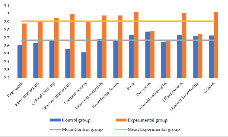 The results found in the descriptive analysis show that the means achieved by the experimental group are superior to those of the control group in all the dimensions analyzed. The averages achieved in all dimensions, both in the control group and in the experimental group, are above 2.5, which demonstrates a medium-high evaluation by students of the general application of flipped learning. The distribution of the sample is normal, since the values of asymmetry and kurtosis are between -1.96 and +1.96 (Jöreskog & Moustaki, 2001). The standard deviation of both the control and experimental group dimensions shows an equal impact among the students. All cases are platikurtic, except for the students’ decision-making about their learning, which is mesokurtic (Table 2).