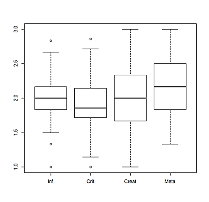 El alumnado valora más alto en pensamiento de tipo metacognitivo, seguido por pensamiento comprensivo. Pensamiento crítico y creativo son los que, a pesar de obtener una puntuación media similar, cosechan más valores negativos, como se ve en la Figura 1.