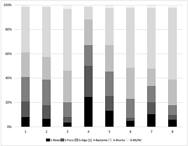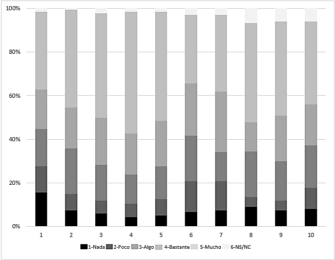 La escala de medida del cuestionario presentaba un sistema de respuesta Likert de cinco puntos (de 1 = nada a 5 = mucho). Se incorporó una opción de respuesta adicional “no sabe/no contesta”.
