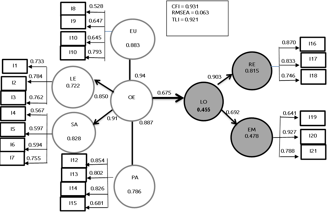 El modelo presenta las relaciones expresadas en el modelo teórico y donde las escalas fueron validadas positivamente. Se muestran, además, los coeficientes estandarizados o cargas factoriales y algunos indicadores de bondad de ajuste, tales como CFI, RMSEA y TLI. Es importante tener en cuenta varios aspectos para la verificación de la hipótesis, ellos son: la significancia estadística, las cargas estandarizadas y el valor de R2 (coeficiente de determinación). La Figura 1 muestra que la organización universitaria explica el 67.5% de la varianza de los logros obtenidos (LO = 0.675, p < 0.010) y asume un poder predictivo del 45.5% (R2 = 0.455, p < 0.010). Por tanto, se confirma la hipótesis de que la organización universitaria (OE) si influye positivamente en los logros obtenidos por la universidad en su involucramiento regional y vinculación empresarial.