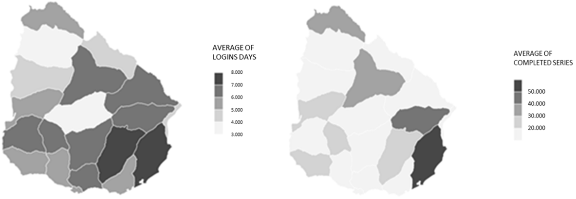 Likewise, we also examined the regions in which students interacted with the platform the most. Substantial variations were observed between the national average (19 completed series) and the departments with the highest completion averages, such as Rocha (74 series) and Treinta y Tres (47 series). Durazno, on the other hand, has the lowest average value, with only 6 series completed. These findings are depicted in the heatmaps in Figure 1.
