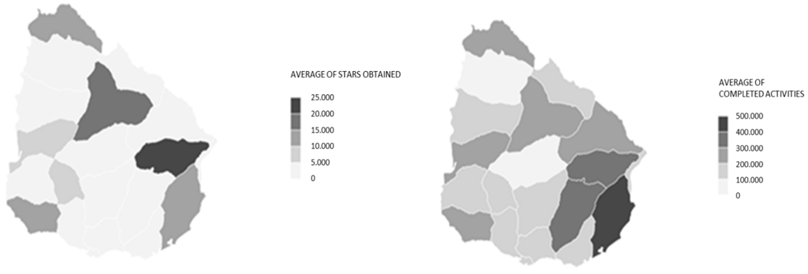The variations in the PAM reward system show favorable outcomes for Tacuarembó and Treinta y Tres, with average values of approximately 24 and 19 stars, respectively, which greatly surpass the national average of almost 5 stars. Conversely, Durazno, with an average of one star, is the department with the lowest average number of rewards on the platform. The heatmaps in Figure 2 provide a visual representation of these findings.
