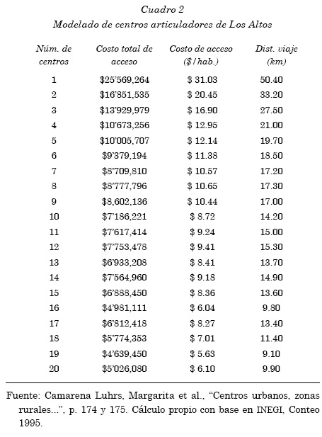 Con base en un modelo de múltiples centros de gravedad en el que la población (entendida como el número de habitantes) representa la fuerza de atracción; y la distancia, los costos de transporte asociados ($/pasajero-kilómetro), se muestran como elementos "repulsivos" de las zonas, llevamos a cabo la identificación de los centros articuladores de la estructura espacial de Los Altos.