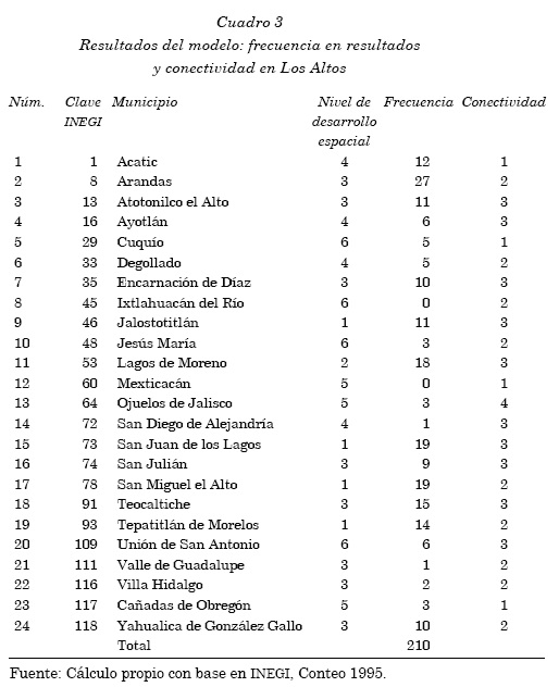 La jerarquización espacial de los municipios considera al desarrollo espacial como su principal elemento que, a su vez, contempla la frecuencia en los resultados del modelo de estructuración del espacio y la estructura nodal. De este modo, con base en una clasificación en categorías definidas por la frecuencia y la conectividad23 de cada uno de ellos, en el cuadro 3 apreciamos las siguientes evidencias de la accesibilidad: