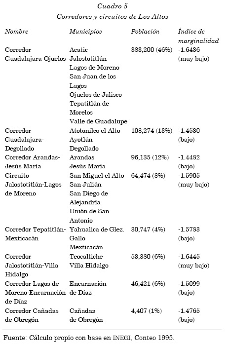 En la estructuración de los corredores y circuitos arriba descrita, se confirma que el gran eje estructurador de Los Altos es el corredor Guadalajara-Ojuelos, ya que sobre este eje se encuentra asentada la mayor proporción de la población (43%), con un grado de marginalidad de -1.6858 puntos, muy bajo. Como se puede apreciar en el mapa 1, desde este corredor se estructura casi la totalidad de los demás corredores, con excepción del Guadalajara-Degollado, que tiene una conectividad secundaria con el resto de los municipios que conforman la región. Por otra parte, destaca que Cuquío e Ixtlahuacán del Río carecen de conexión con la red de Los Altos.