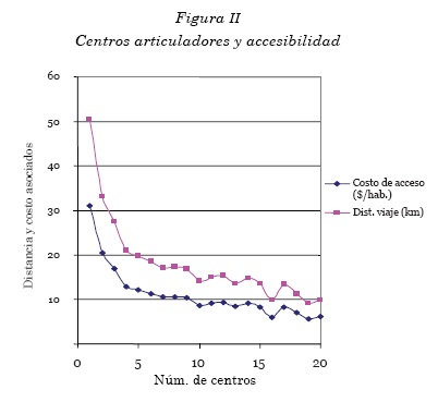 Según las características de la región, es posible hacer un análisis desde un centro articulador hasta veinte de ellos y de este modo cubrir todos los municipios alteños. Como se puede observar enseguida, los resultados del modelo permiten identificar las diferentes medidas de eficiencia obtenidas a partir de la accesibilidad desde esos centros hacia las zonas inmediatas (véanse cuadro 2 y gráfica II).