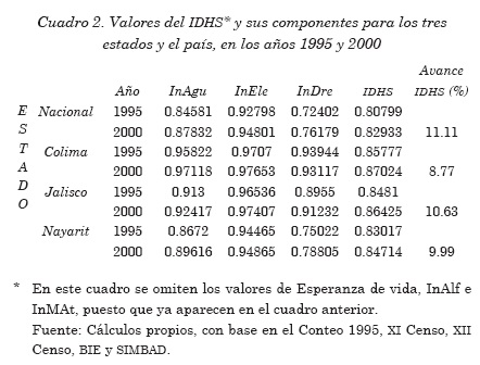 Nayarit mostró un avance de 9.99% en el IDHS para el periodo 1995-2000 y se ubicó en un nivel de desarrollo alto; y aunque el avance del estado fue 1.12% menor que el promedio nacional, los valores que registran todas las componentes en el estado superan a los valores correspondientes del país (cuadro 2), ubicándose en la posición décimo cuarta entre las entidades federativas del país. En términos comparativos, Nayarit presentó un desarrollo 4.56% menor al del Distrito Federal (0.88764, máximo del país) y 16.30% mayor al de Oaxaca (0.72843, mínimo del país).