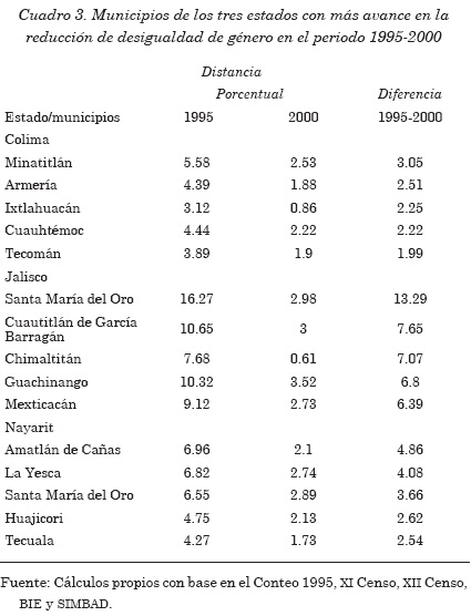 En 1995 tres municipios, habitados por 5.3% de la población estatal, presentaban un desequilibrio altamente significativo en el desarrollo (desfavorable a la mujer). El resto de la población vivía en municipios con desequilibrio significativo, y no se registró municipio alguno con desequilibrio no significativo. Para el año 2000 ningún municipio presentó un desequilibrio altamente significativo; un municipio (Tepic) presentó desequilibrio no significativo; el resto de la población (66.83%) vivía en municipios con desequilibrio significativo. Los municipios que más redujeron su desequilibrio en el quinquenio fueron: Amatlán de Cañas (4.86%), La Yesca (4.08%), y Santa María del Oro (3.66%), entre otros (cuadro 3).