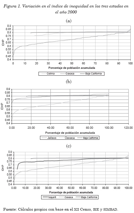 El estudio de variación e inequidad en el 2000 mostró que la entidad ocupó la posición 23 entre las 32 entidades federativas, con un índice de inequidad igual a 0.16020; lo que equivale a 39.6% menor que el promedio del país; 62.7% menor que el de Oaxaca, y 31.6% mayor que el de Baja California) (figura 1c). El estado presentó un rango de 0.20046 entre el IDHP máximo (0.80343) y el mínimo (0.632097).