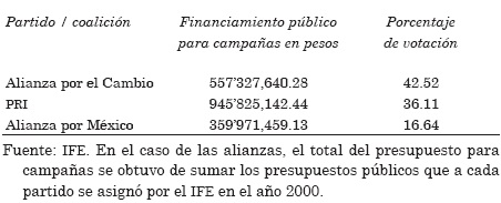 Al contrario, como se muestra en el siguiente cuadro, la Alianza por el Cambio fue la que resultó triunfadora en las elecciones presidenciales, pero no fue la que más recursos invirtió en la campaña, lo que contradice la aseveración de que "a mayor presupuesto (dinero), mayor número de votos."