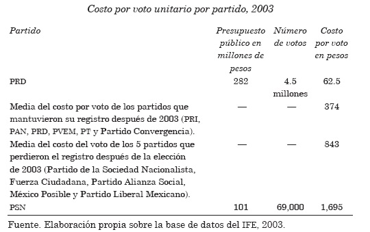 Ahora bien, si desglosamos los presupuestos recibidos por partido en relación con el número de votos obtenidos, obtendremos el costo unitario en pesos por voto por cada partido político, que muestra que para algunos partidos, como el caso del PRD, el costo del voto fue el más bajo, mientras que para otros, como el caso del Partido de la Sociedad Nacionalista (PSD), el costo del voto fue de los más altos, como se muestra en el cuadro de la página siguiente. Esto habla de la racionalidad y la eficiencia en el uso de dichos recursos en su relación con el objetivo alcanzado.