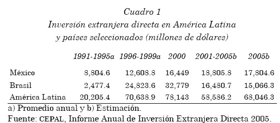 Durante la primera mitad de la década, la IED anual promedio en la región fue de 20,205.4 millones de dólares, pero en la segunda mitad que registró la crisis económica de México en 1994 y las subsecuentes en Asia y Rusia que impactaron fuertemente en la región, se elevó el promedio anual de inversión extranjera directa en América Latina a 70,638.9 millones. Para el año 2000, la IED se disparó a 78,143 millones de pesos pero en los años subsecuentes registró una baja, para colocarse el promedio anual entre 2001-2005 en 58,586.2 millones de dólares. Cabe señalar que si se observa sólo el año 2005, la IED vuelve a remontar a 68,046.3 millones dejando en evidencia la volatilidad de este indicador en la región (CEPAL, 2005). México y Brasil se consolidaron como los dos principales destinos de flujos internacionales de inversión directa (cuadro 1).