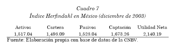 México registra alta concentración en todos los componentes del sistema bancario, la mayor se da en utilidades netas al rebasar el límite considerado por el índice Herfindahl como recomendable para una óptima competencia (véase el cuadro 7).