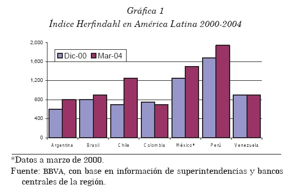El cálculo realizado por el español BBVA con datos a marzo de 2004, establece que el país con mayor concentración es Perú, seguido por México, Chile, Brasil, Venezuela, Argentina y finalmente, Colombia.