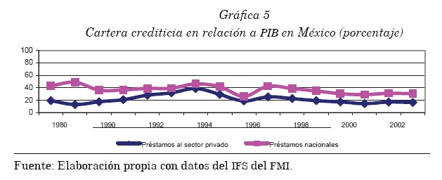 Al cierre de 2003, la cartera crediticia doméstica destinada al sector privado apenas representaba 16% en México; 28.8% en Brasil; 10.6% en Argentina; 32.3% en la República Checa; con un lejano 64% está Chile, y Corea con 93% respecto del PIB12 (véase la gráfica 4).