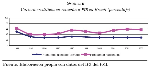 Con base en la información para México y Brasil se observa que tras ocho años de política clara de apertura para la instalación de instituciones bancarias foráneas en materia crediticia, no hay una tendencia clara de crecimiento en los niveles de crédito, y mucho menos en el destinado al sector privado, el cual constituye la planta productiva de un país (véanse las gráficas 5 y 6).