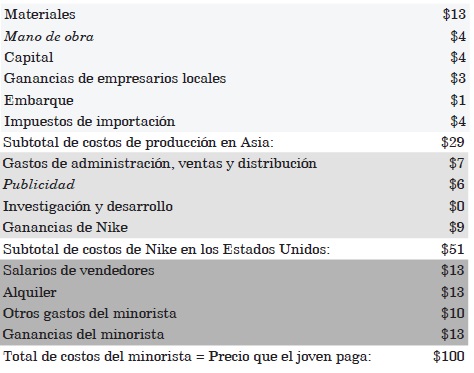 Hay ciertas formas de argumentar que están calculadas para despertar en nosotros una profunda indignación moral. Nos topamos con un ejemplo notable de ello cuando Vogel (2006: 99-100) menciona a "críticos de Nike" que suelen tomar el salario de 1 ó 2 dólares por jornada de trabajo a obreros en Indonesia que participan en la producción de calzado deportivo de esa marca a fin de contrastarlo con los miles de dólares que recibe Michael Jordan por publicitar ese mismo calzado. Para terminar de clavar la estaca en el corazón de su lector, Vogel hace la comparación aún más dolorosa citando al periodista Jeff Ballinger que en Harper's concluyó que una obrera indonesia requeriría trabajar 44,492 años para ganar lo que estipula el contrato del famoso basquetbolista (Ballinger 1992). Dejando de lado la comicidad involuntaria de un cálculo tan aparentemente preciso, ¿habrá quien no se indigne ante semejante disparidad en los ingresos? Y sin embargo, basta ponerse a pensar un poco para darse cuenta de que este modo de discurrir tiene muy poco sentido. Es al menos probable que sin los anuncios de celebridades como Jordan, Nike jamás podría tener una demanda tal que permitiera la creación de complejas cadenas de producción en cuyo extremo estaría una trabajadora no calificada que tal vez todo lo que hace a lo largo de un día es poner en una caja un zapato derecho y uno izquierdo. Por otro lado, la impresión de una disparidad casi inconmensurable proviene de un cálculo muy sesgado. Propongo al lector otro para que compare. Partamos de uno solo de esos pares que la obrera empacó. Supongamos un joven norteamericano tan consciente de la moda que hace lo que puede (desde atormentar a sus padres durante semanas hasta vender un poco de cocaína en las calles) para conseguir 100 dólares y pagarlos por el último modelo de Nike. ¿Cuánto de esos 100 dólares le tocan a Jordan y cuánto a la trabajadora indonesia? En una reciente introducción a la economía se ofrece una estimación de los costos, que sería aproximadamente la siguiente:1