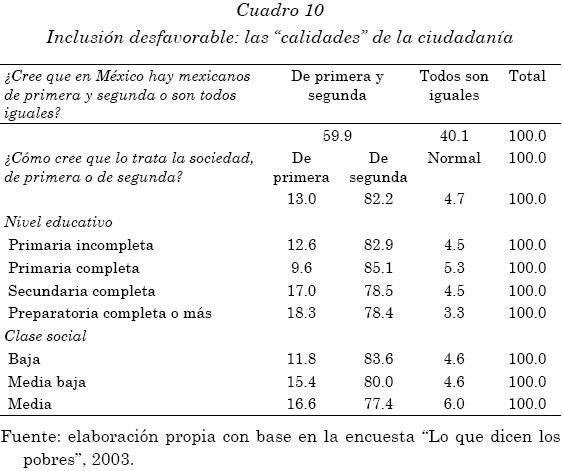 La marcada desigualdad en la distribución de oportunidades y la segmentación social que caracterizan a la sociedad mexicana se hacen evidentes en el reconocimiento de calidades diferenciadas de ciudadanía: 6 de cada 10 entrevistados considera que en el país hay mexicanos de primera y de segunda, y 8 de cada 10 se considera tratado como ciudadano de segunda (cuadro 10), percepción particularmente extendida en los menores niveles educativos y entre quienes se definen como de clase baja.